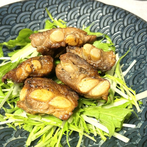 豚なんこつのにんにく醤油焼き。濃いめの味付けでお酒も進んで付け合わせの野菜もたっぷり食べられるコラーゲンおつまみ。