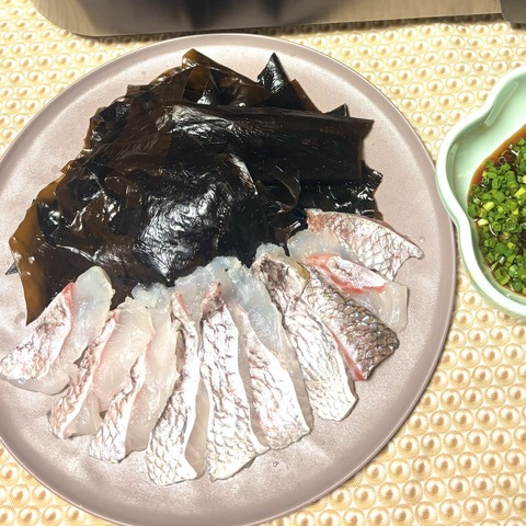 生わかめと皮付き真鯛のしゃぶしゃぶ。超ヘルシー、たんぱく質と食物繊維が摂れる旬のおつまみ。