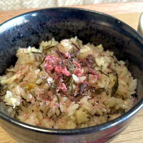桜香る鯛めし。鯛のアラでお得に旨みたっぷり、桜の葉と花の塩漬けで春の香りの炊き込みご飯