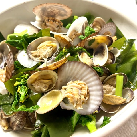 春の酒蒸し(ホタテ稚貝、アサリ、菜の花、生わかめ)。ヘルシーなのにうまみたっぷり、酒飲みさんに優しいおつまみ。