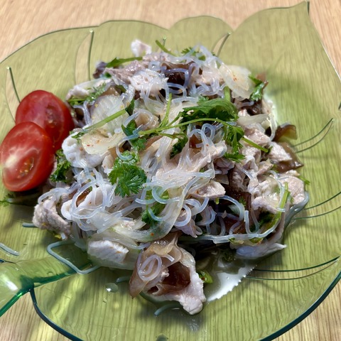 豚しゃぶと春雨のタイ風サラダ。あまりがちなナンプラーを使った、まだまだ暑い日にぴったりのさっぱり食べ応えもあるおつまみ。