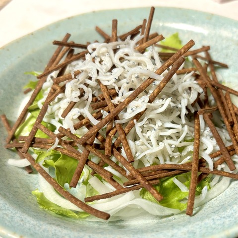 新玉ねぎと釜揚げしらすと揚げ蕎麦のサラダ。旬を味わう、お酒も進む、居酒屋さん風のサラダ。
