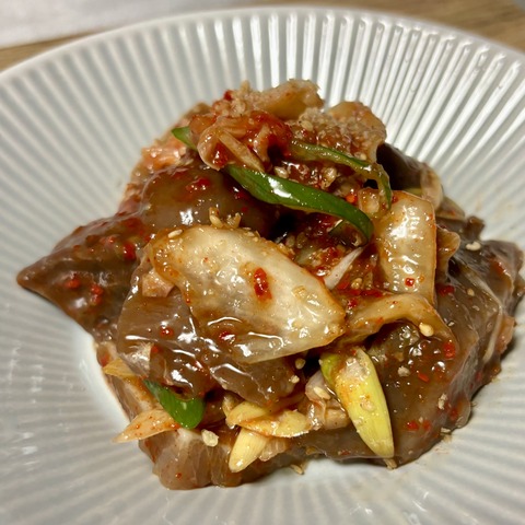 鰹のづけとねぎのキムチ和え。づけにした鰹のねっとり感とネギとキムチのシャキシャキ感が···